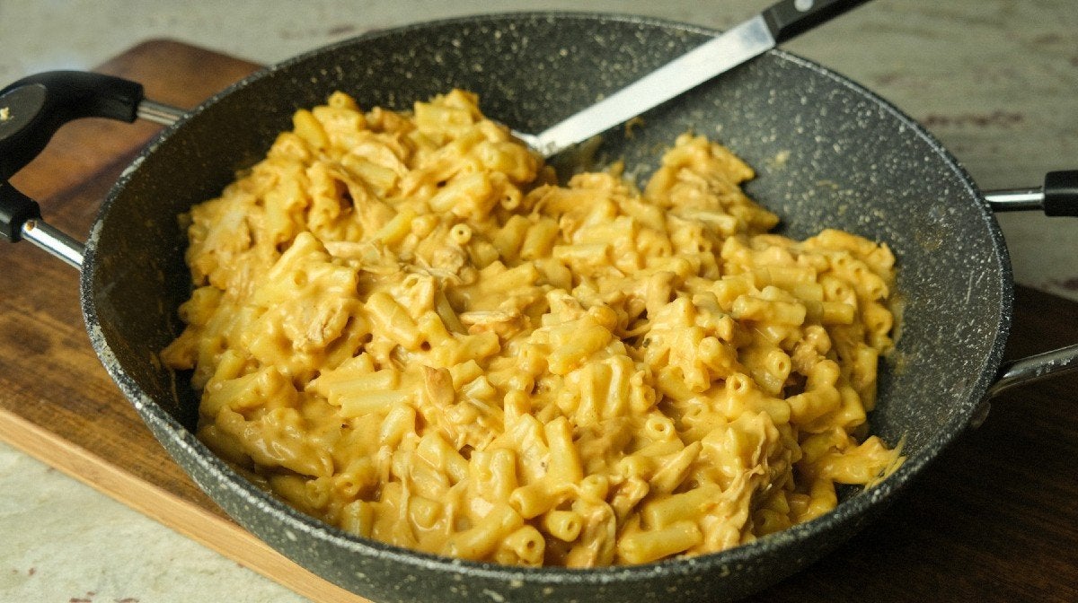 - Then, add the low-fat cheddar, stirring until it melts into the white sauce, and then finally add your shredded BBQ chicken and cooked macaroni pasta. Stir well to make sure everything is combined.