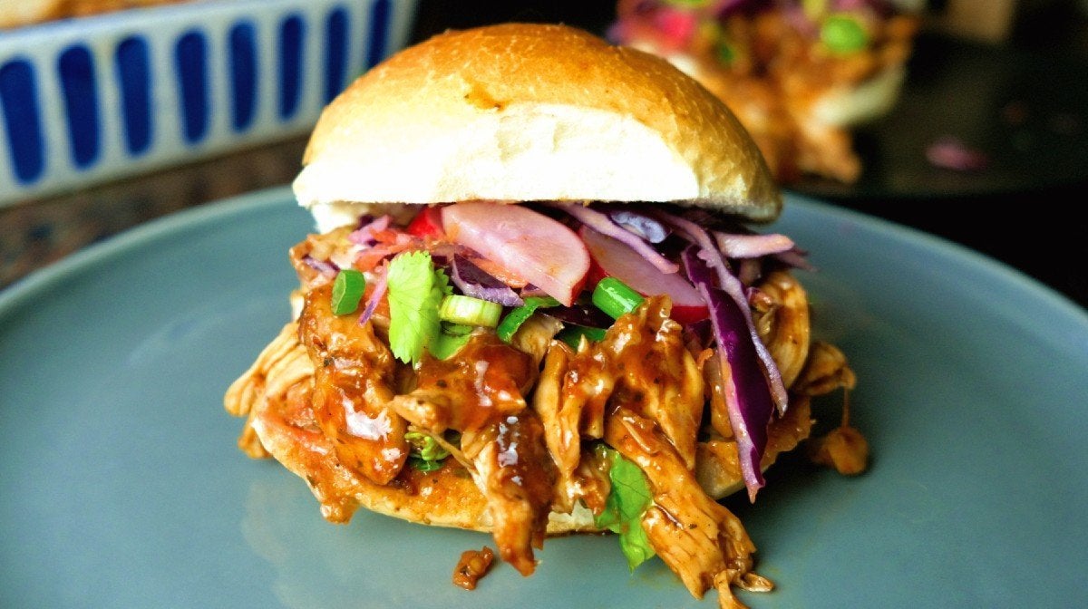 - Now you’re ready to build your sandwiches – apply roughly a teaspoon of light mayonnaise to the bottom of your bap, then pile with plenty of pulled BBQ chicken, top with slaw and garnishes. Bon appetit!