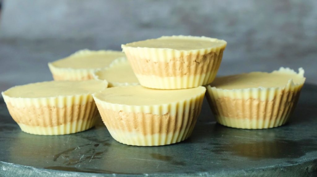 - Now mix together the melted peanut butter, vanilla protein, and maple syrup — you should get quite a solid, almost dough-like consistency. Divide this into the 6 cupcake moulds on top of the white chocolate layer.